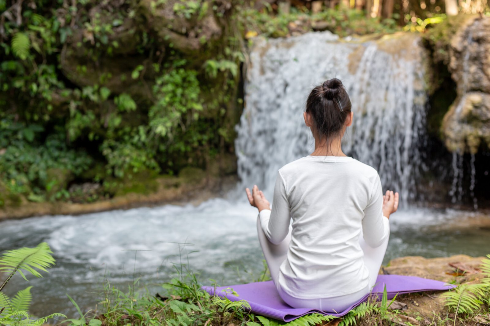 Beautiful girls are playing yoga at the park. Among the natural waterfalls in the forest, exercise concepts